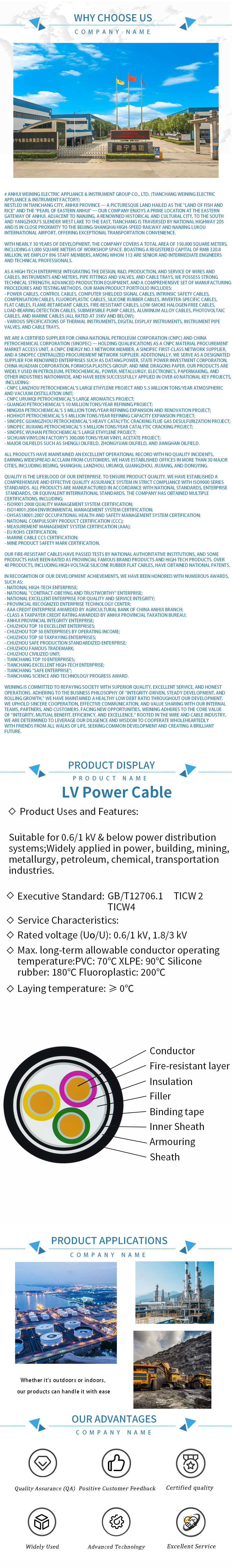 Üstün yapısal tasarıma sahip ürünler, dış müdahalelere, aşınmaya, ekstrüzyona ve zorlu iklim koşullarına etkili bir şekilde direnerek olağanüstü yalıtım ve koruma performansına sahiptir. Optimize edilmiş iç yapı, sorunsuz güç dağıtımı ve istikrarlı sinyal iletimi sağlayarak enerji kaybını azaltır ve genel operasyonel verimliliği artırır. Her kablo, uluslararası endüstri güvenlik standartlarına ve sertifika gerekliliklerine uygundur, kurulum sırasında yüksek güvenliği ve uzun süreli sürekli çalışmayı garanti eder ve kullanıcılar için olası bakım ve değiştirme maliyetlerini azaltır.